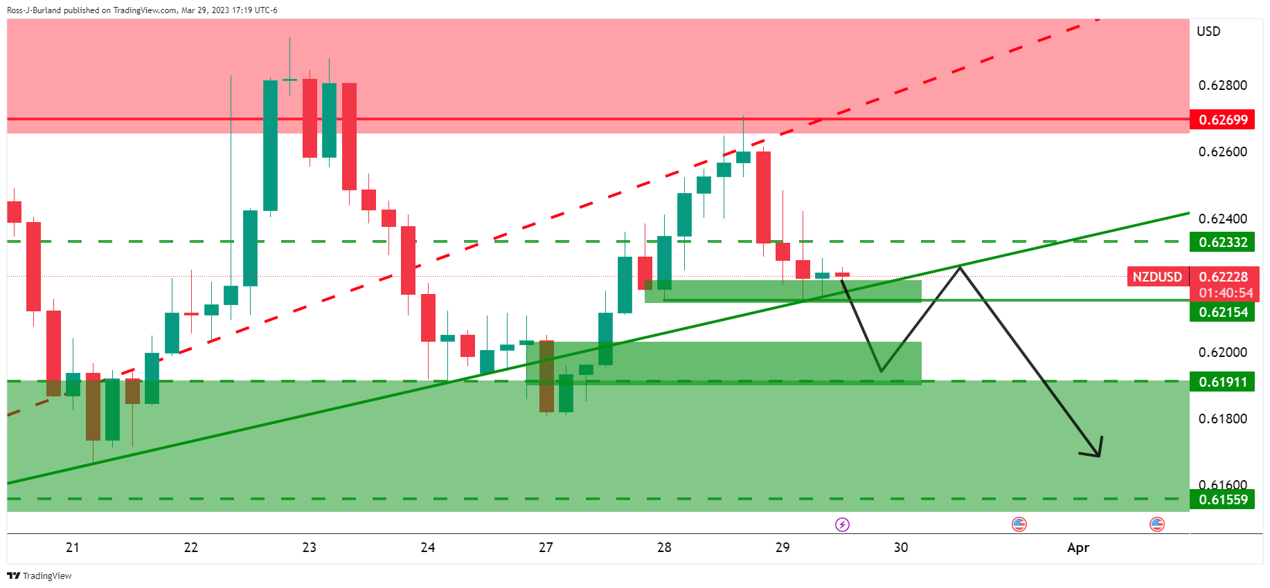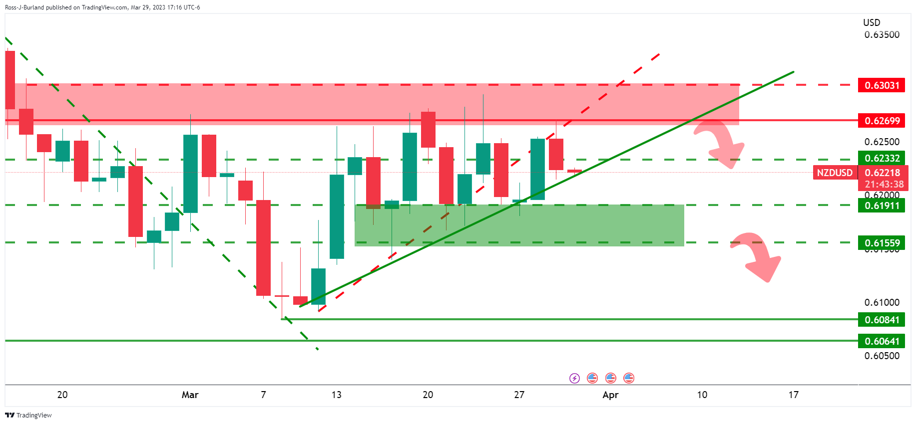 - 纽元/美元4小时图显示,本周的最后几天需要跌破0.6215。