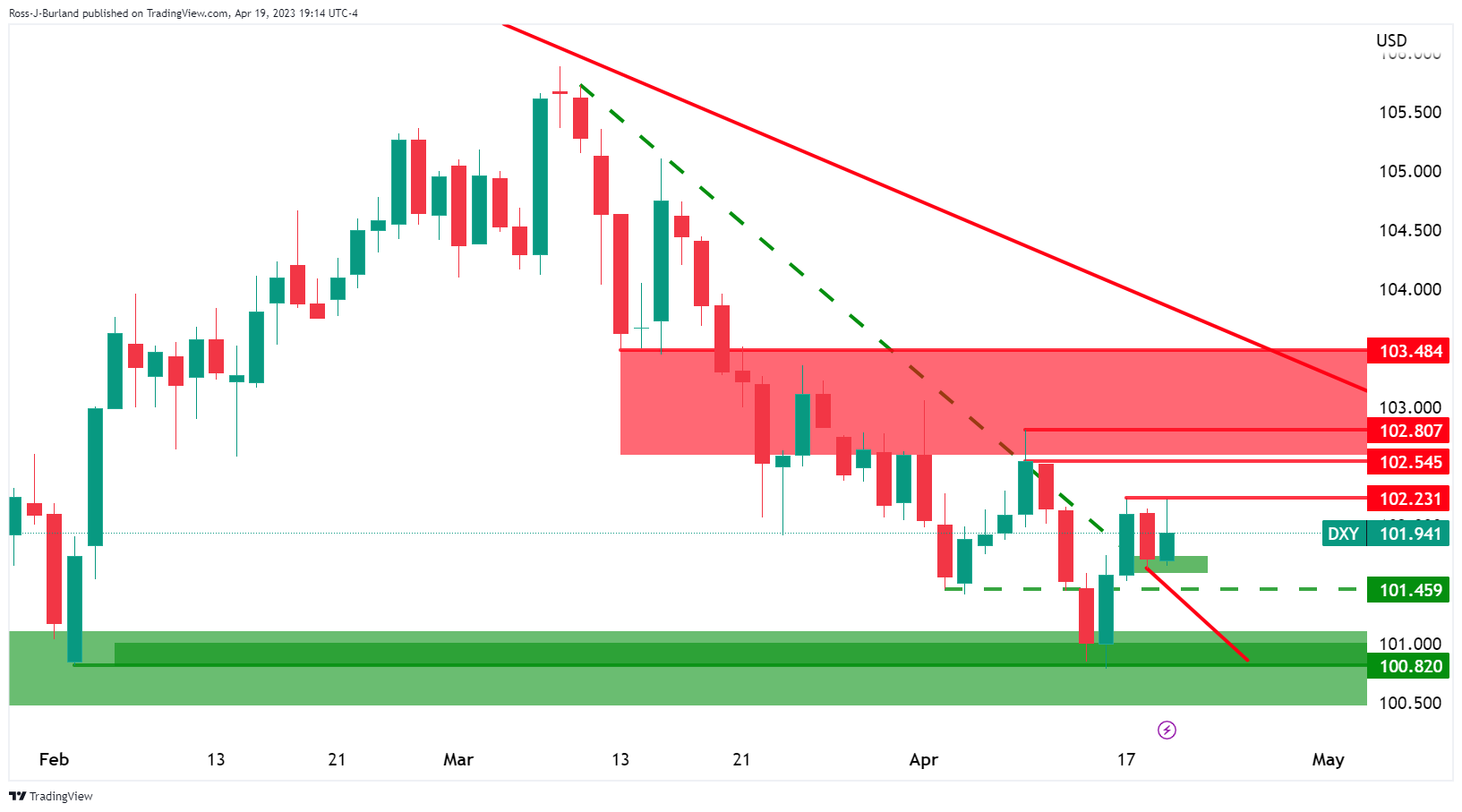 美元日缐上涨,目标指向102.20阻力,整理倒转趋势缐支撑。