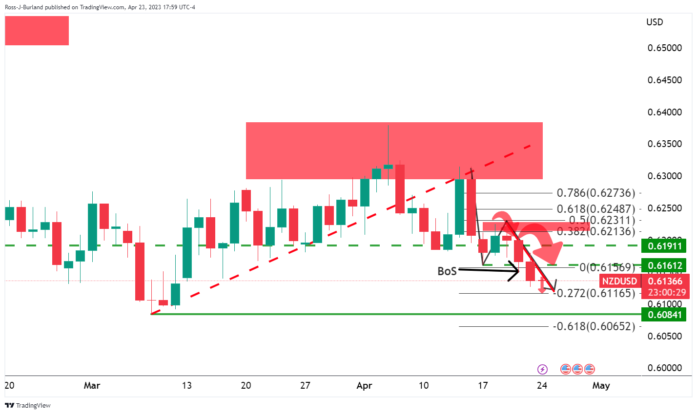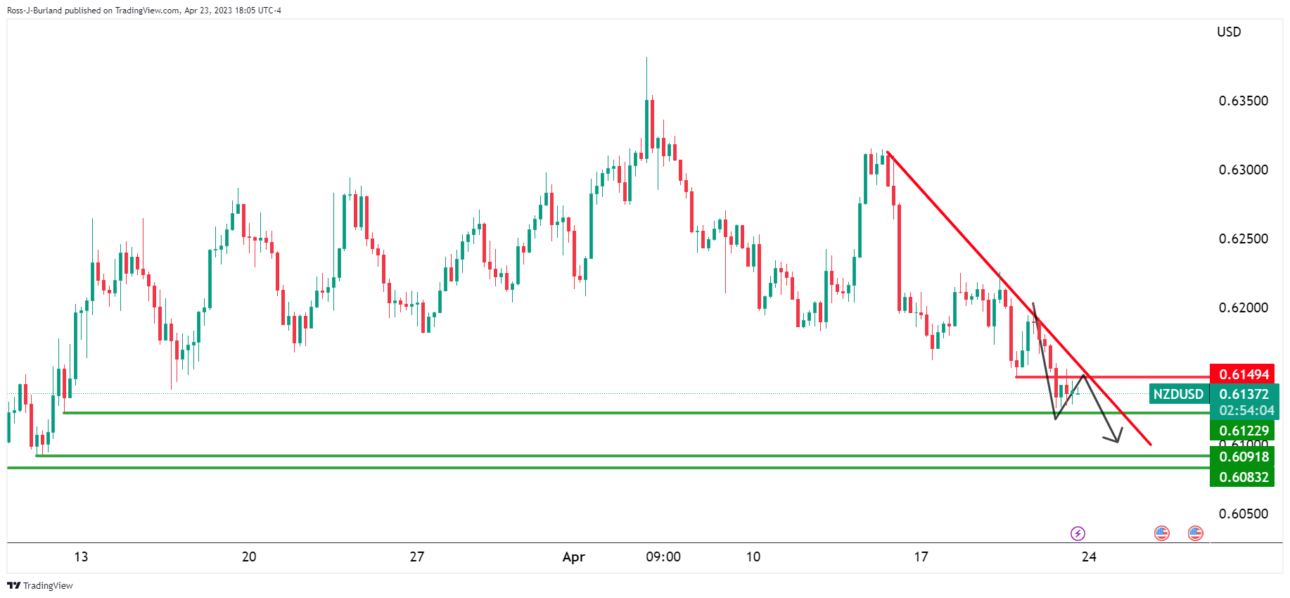 纽元/美元处于小型看跌趋势的正面,回撤到斐波位,正测试处在0.6150和0.6170之间的看跌阻力范围。