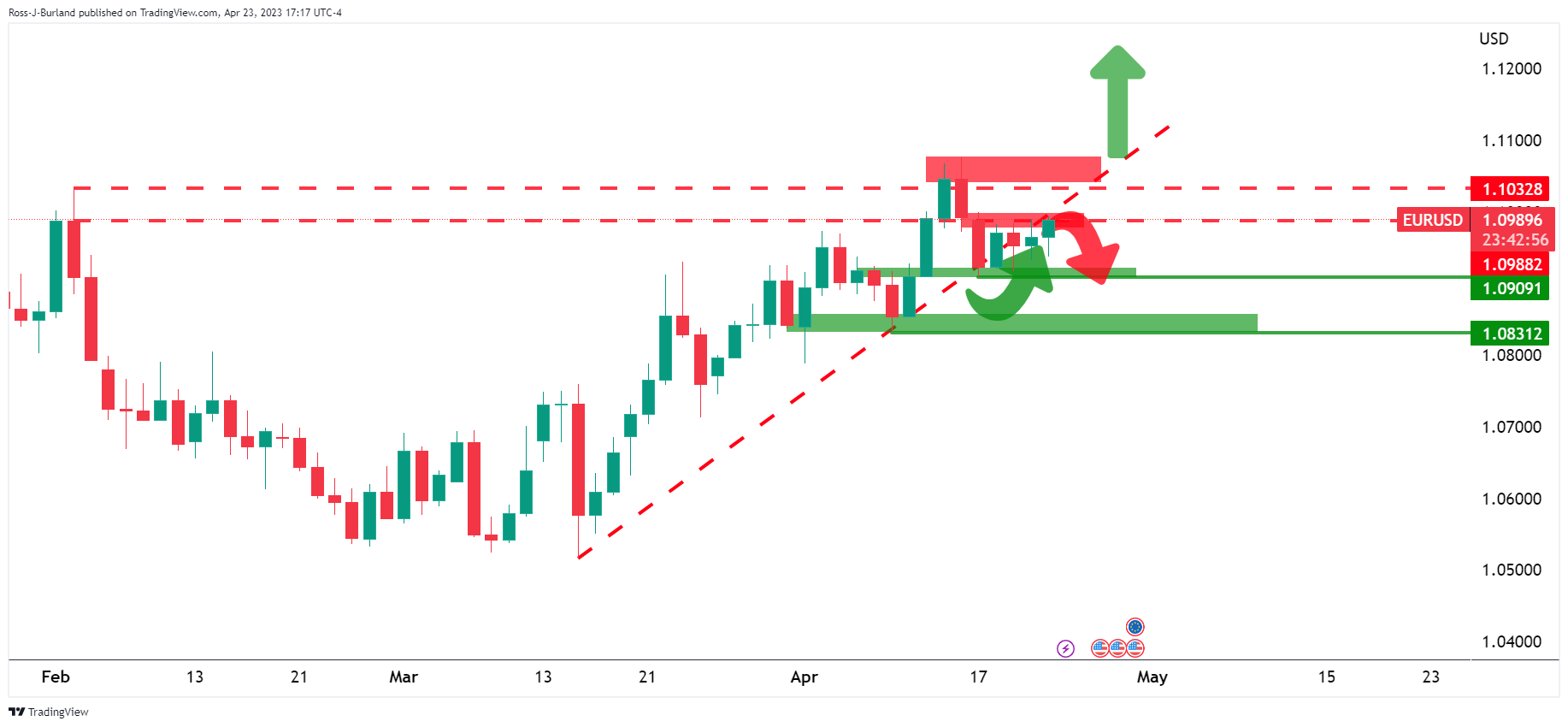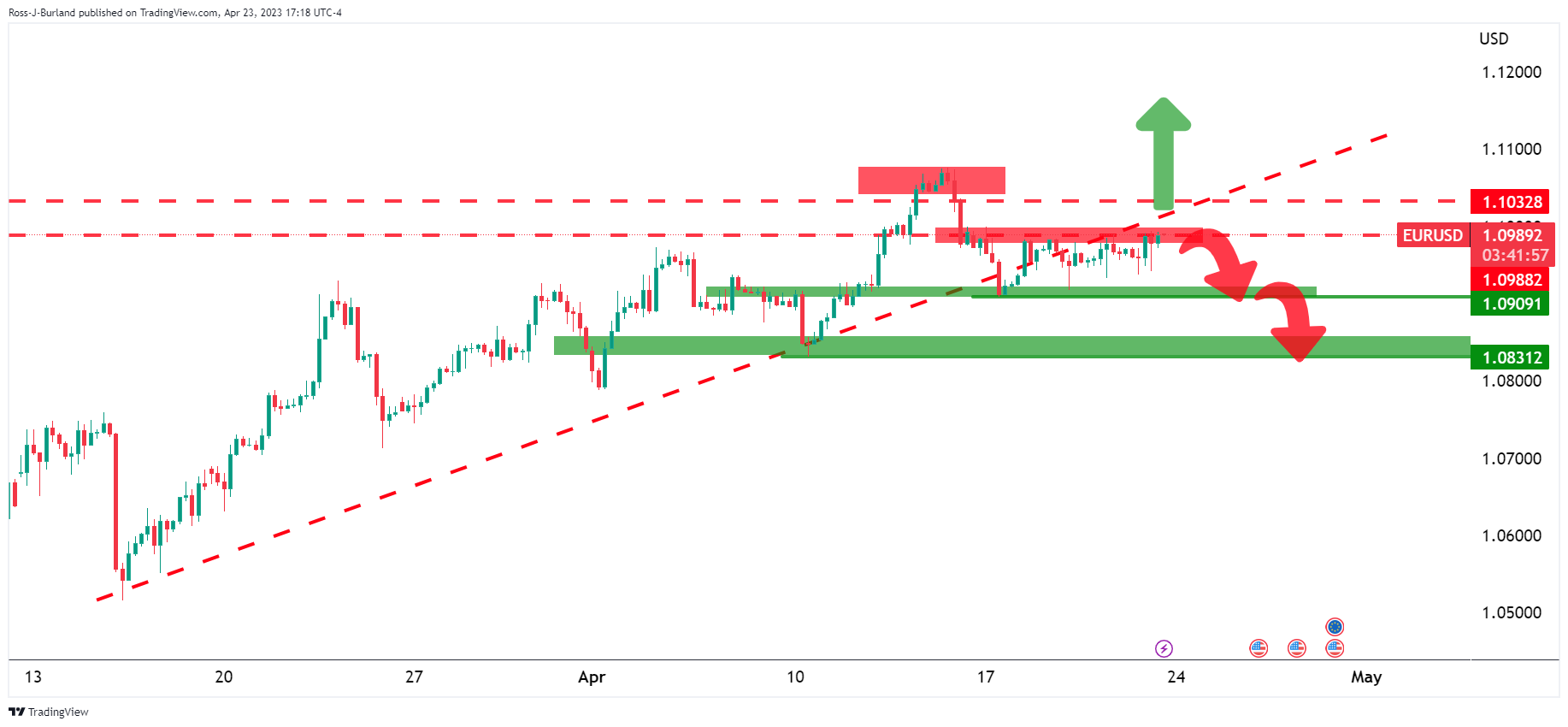 如果突破继续寻求跌破1.1000并且欧元/美元在处在看涨趋势的背面,那麽欧元/美元跌破1.0910后,就会展𫔭进一步下跌的风险: