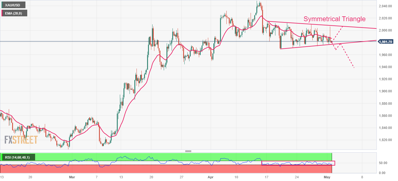 4小时图显示金价盘整于对称三角形形态,在关键事件之前金价波动大幅收缩。上述形态的上行趋势缐始自4月19日的低点1,969.26美元,下行趋势缐则始自4月17日的高点2,015.23美元。