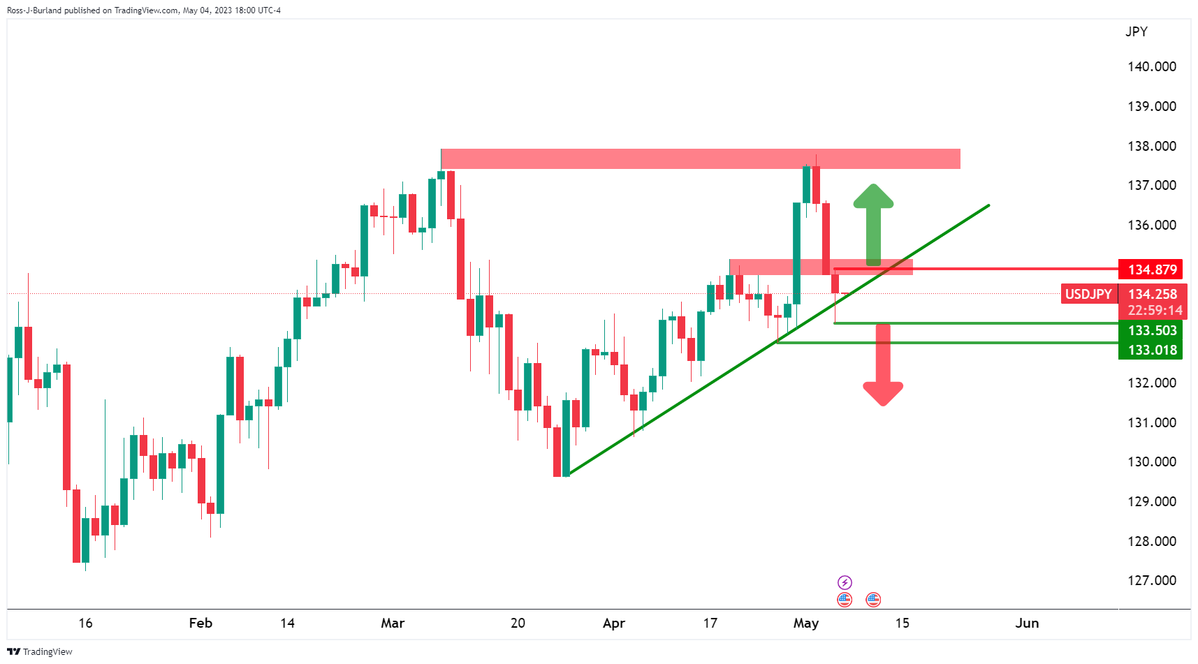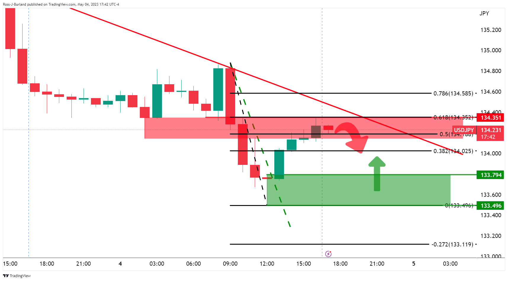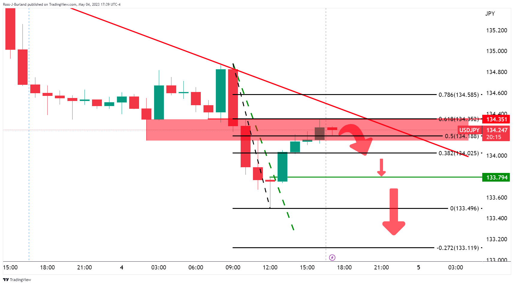 美股𫔭盘后美元/日元遭到大量抛售,但多头从当天的低点反转至133.50,现在该水平构成周五非农就业的关键支撑。上图是看跌情况,133.20-00被视為近期目标。