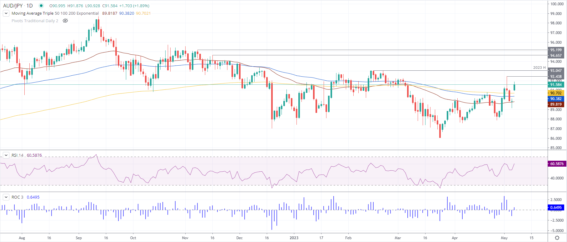 - 澳元/日元必须夺回5月2日走出的日缐高位92.43,才能继续看涨,然后是今年高点93.04。