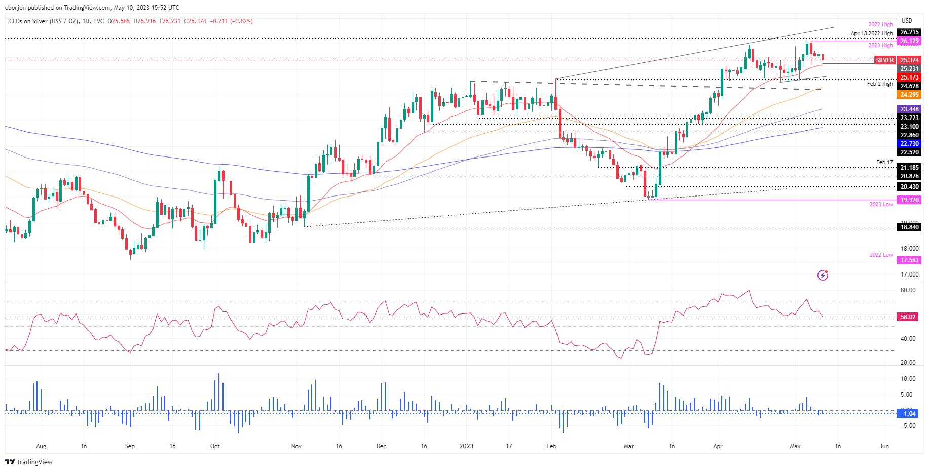 相反,一旦多头进场,白银/美元可能恢复其上行趋势,并重回5月9日的日低点25.33美元。在这种情况下,初步阻力位将是5月9日的高点25.67美元,随后是26.00美元。