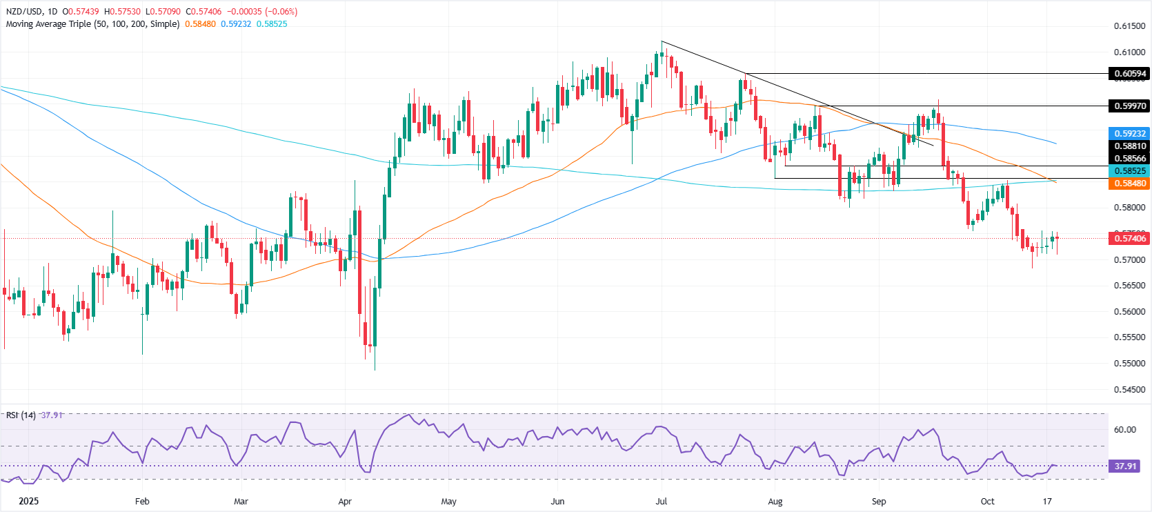 - 纽元在0.5700–0.5760区间内受限,相对强弱指数(RSI)显示多头和空头之间的犹豫。