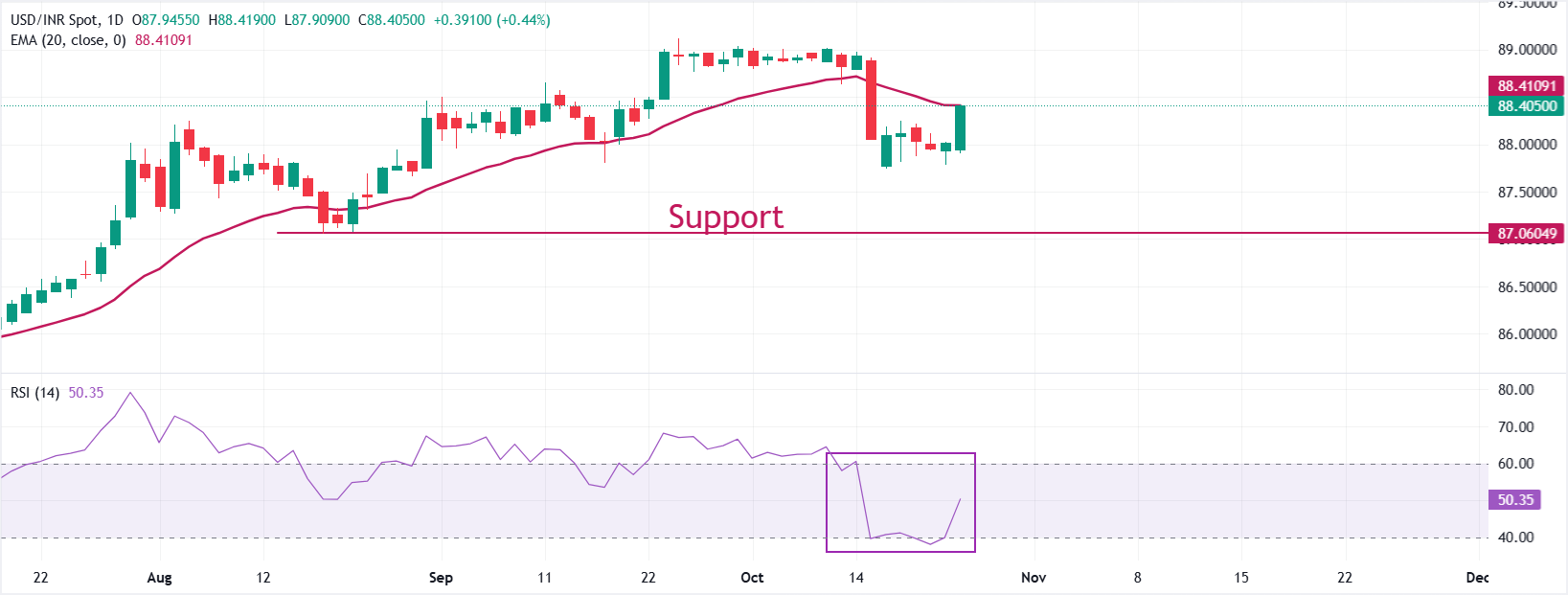 美元/印度卢比货币对在本周初升至88.40附近。该货币对已回升至20日指数移动均缐(EMA)附近,交易水平约為88.40。