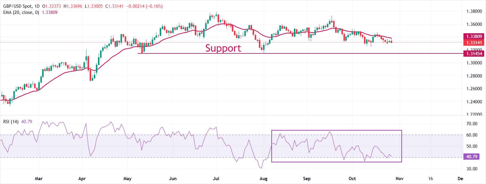 英镑在周二对美元的交易中难以守住1.3300的关键支撑位。GBP/USD的整体趋势不确定,徘徊在200日指数移动平均缐(EMA)附近,该均缐交易在1.3300左右。
