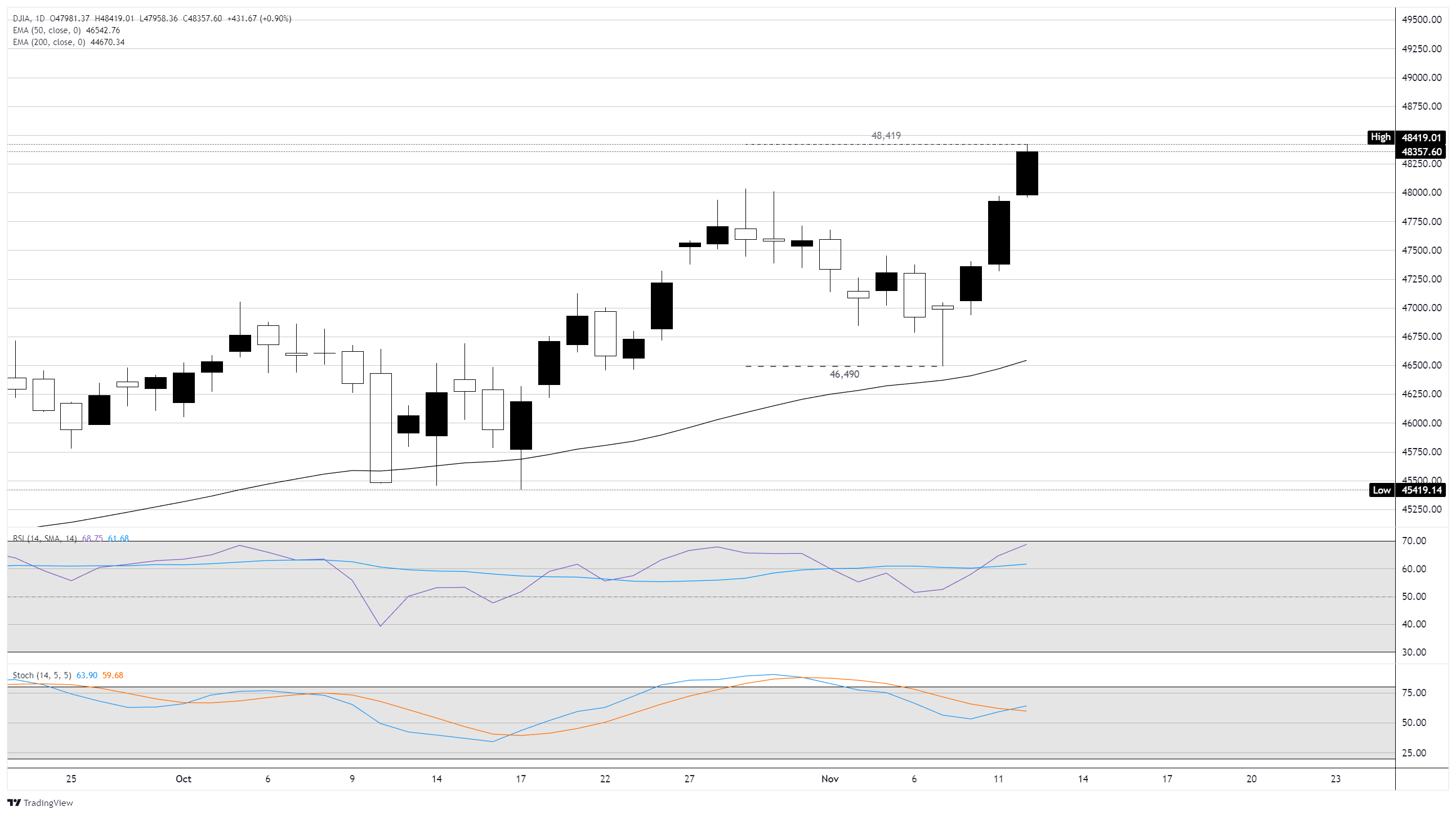 道琼斯上涨约430点,创下48,419的新日内高点,因為这一轻科技的主要指数受到交易者重新投入传统投资的推动。道琼斯在经历了从接近48,000的最后纪录高点的轻微回调后,目前在四天内上涨约4%,此前曾跌至46,490。
