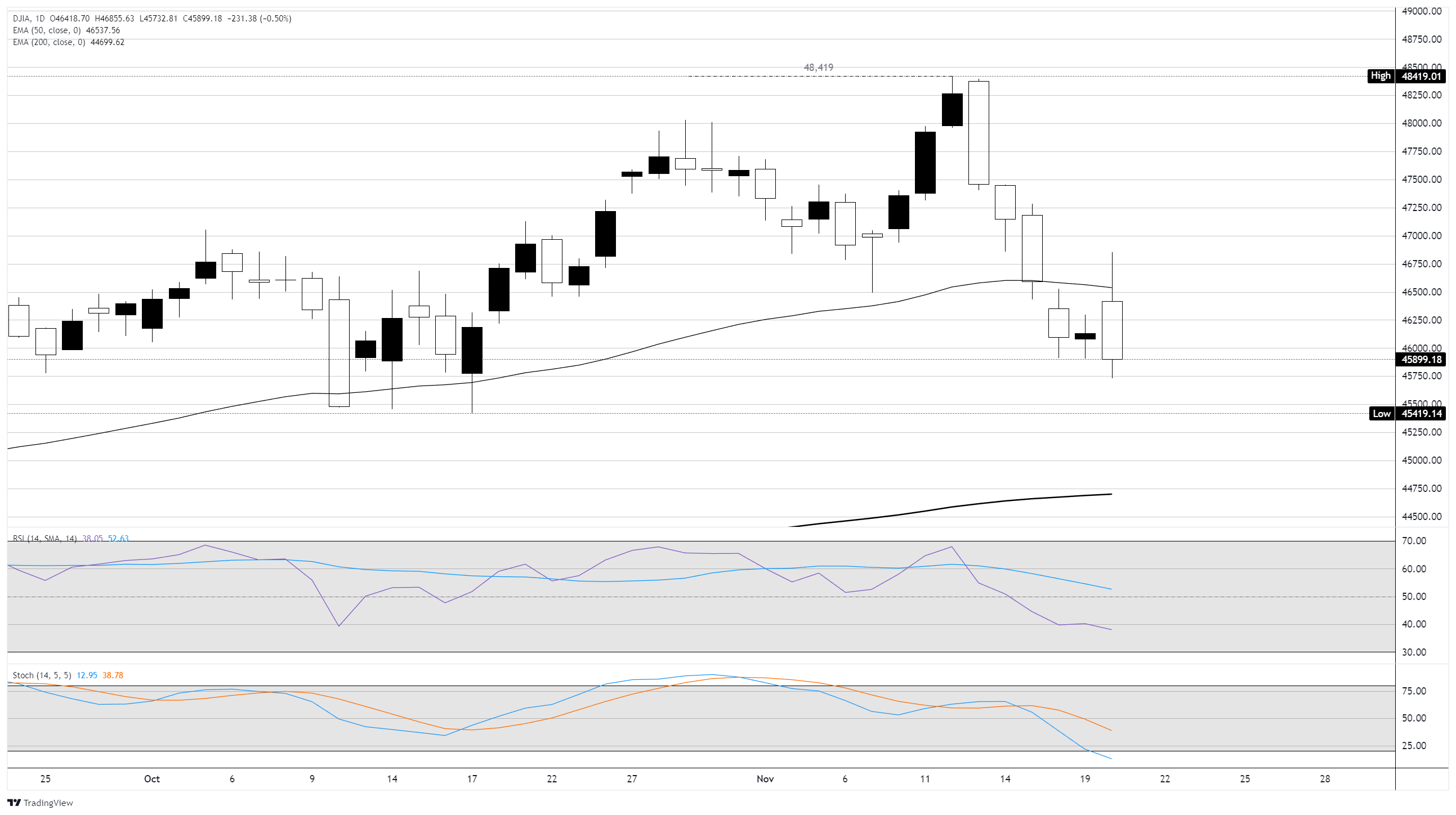 道琼斯工业平均指数本周下跌2.2%,有望创下自10月初以来最差的周表现。股市面临全方位的新挑𢧐,科技股重镇纳斯达克100指数当天下跌约0.6%,并测试了近九周来的最低报价。道琼斯在午盘交易中找到支撑,重新夺回46000点关口,但随后又回落至当日低点,周四下跌约0.65%。