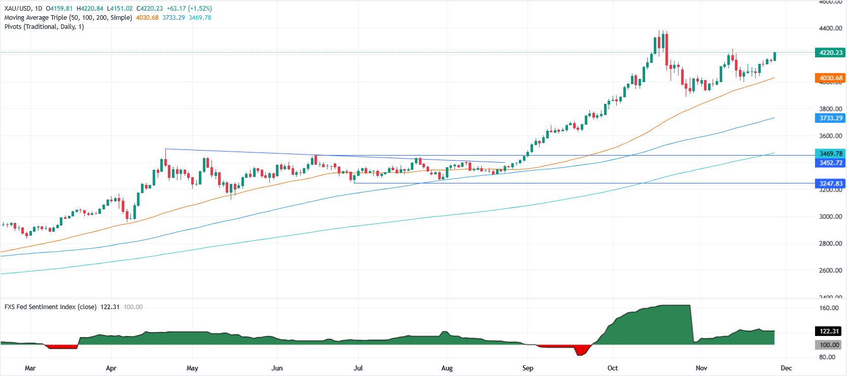 金价在对12月的广泛鸽派重新定价中稳固在4200美元以上