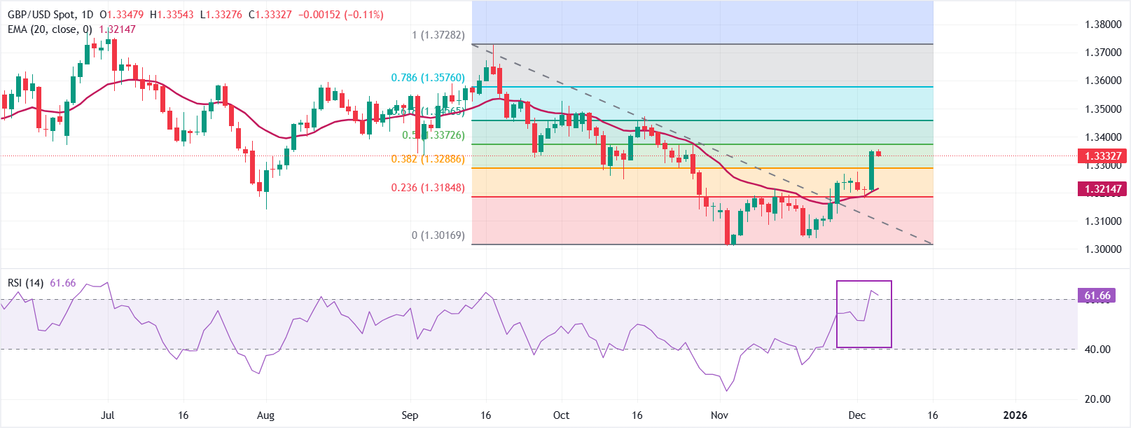 英镑在周三接近1.3350的月高点交易。该货币对维持在1.3215的上升20日指数移动平均缐(EMA)之上,保持短期看涨偏向。20日EMA在最近的交易中呈上升趋势,回调幅度保持较小。