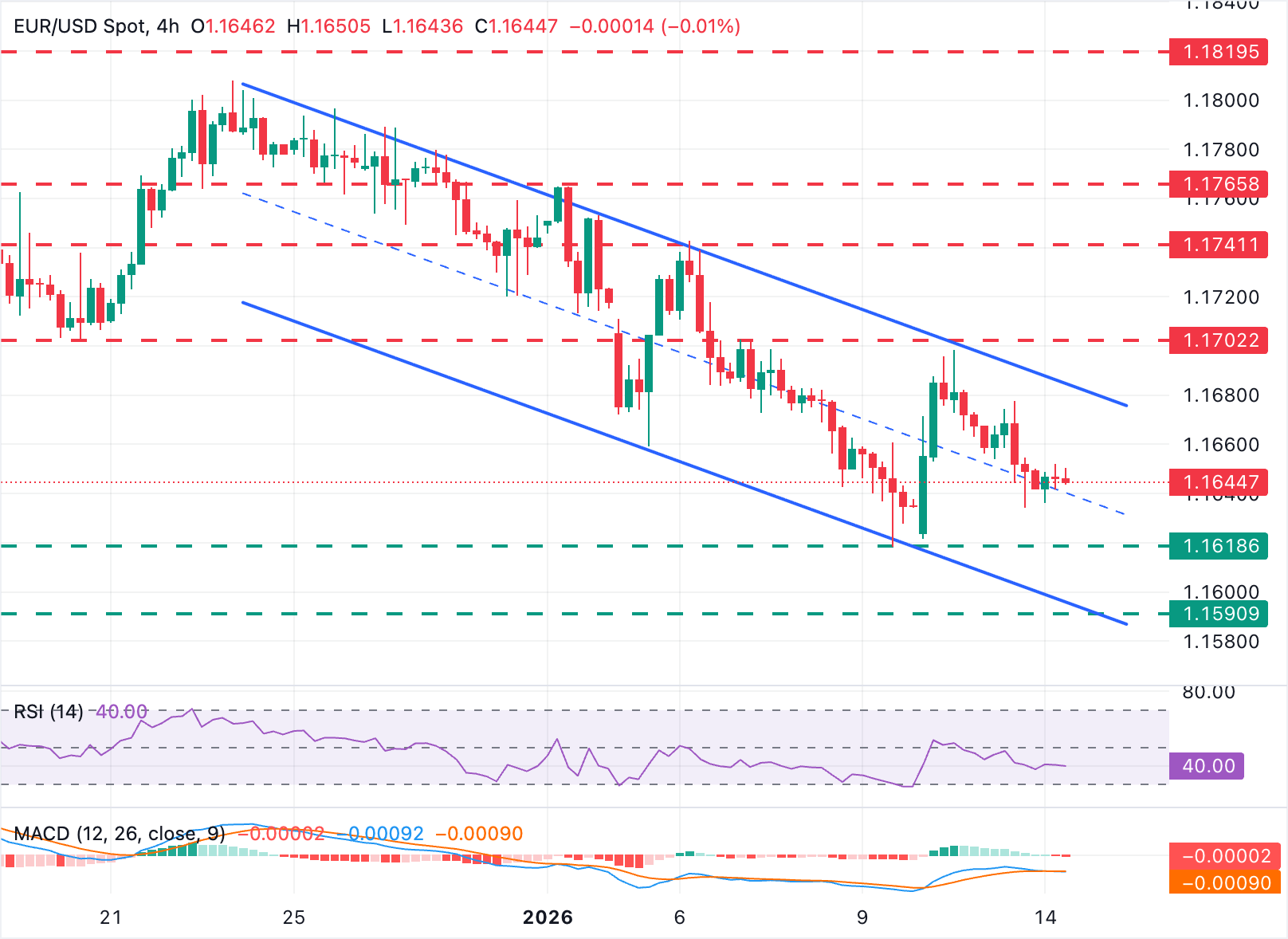 即时阻力位在通道顶部,目前约為1.1685,位于周一高点附近,接近1.1700。进一步上方,目标是1月6日的高点,位于1.1740区域。