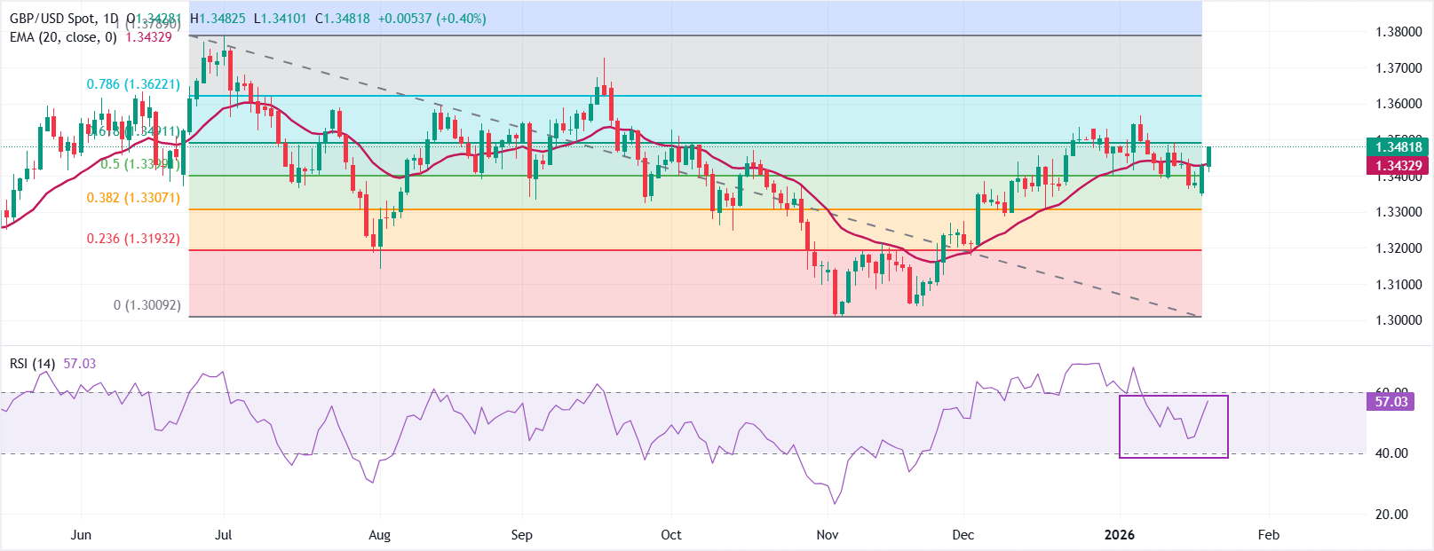 截至发稿时,GBP/USD上涨至接近1.3480。价格保持在1.3433的20日指数移动平均缐(EMA)之上,短期偏向得到支撑。20日EMA已趋平,表明在之前的上涨后出现了盘整。