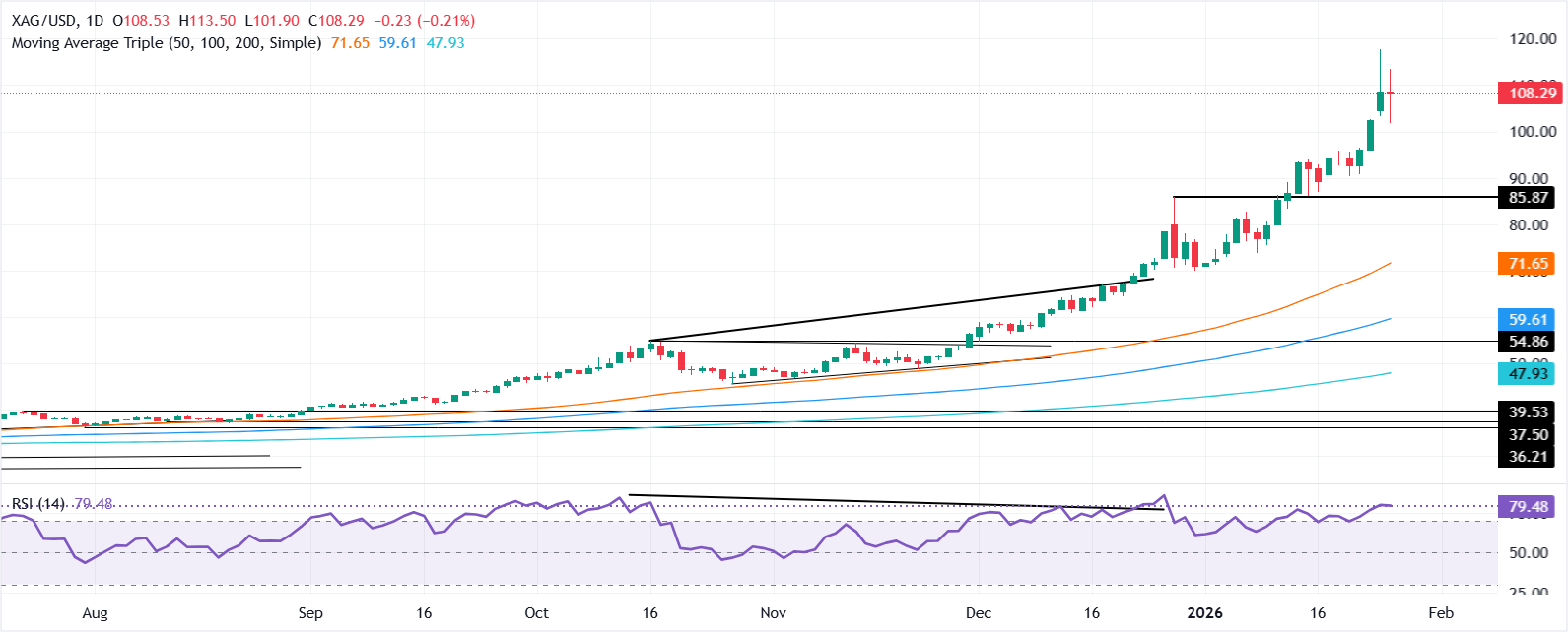(此故事于1月27日20:03 GMT更正,称周一银价收盘价為108.52美元。)