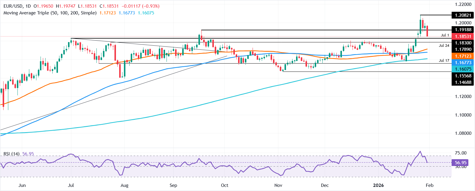 在北美交易时段,欧元/美元下跌0.75%,整体美元强势主导市场,受特朗普温和鹰派提名美联储主席和一份支持美联储维持利率的通胀报告的推动。截至发稿时,该货币对交易于1.1882,低于日内高点1.1974。