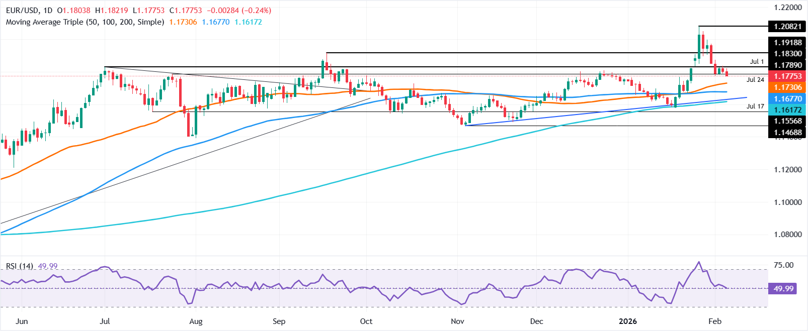 看涨偏向依然存在,因為价格位于50日、100日和200日简单移动均缐(SMA)之上。欧元/美元的首个支撑位為1.1732的50日SMA。相对强弱指数(RSI)虽然中性,但暗示整合,而该货币对仍高于50日SMA。