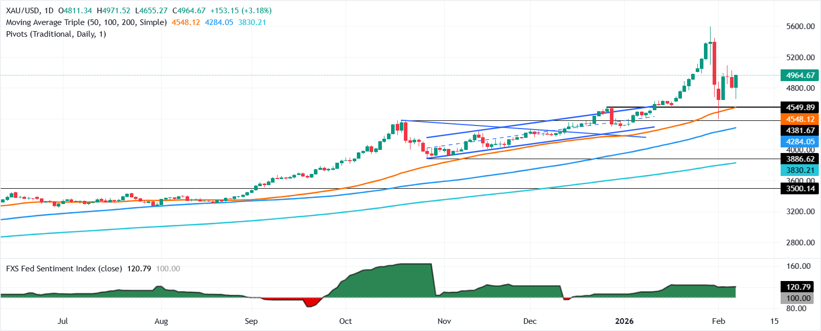 黄金价格(XAU/USD)在周五上涨超过3%,有望实现可观的周度涨幅,因為逢低𧹒家出现,此前该金属在交易中跌破4800美元。值得注意的是,周五的交易波动较大,非收益金属跌至4655美元的三日低点,随后抹去了之前的损失。截至发稿时,XAU/USD交易于4963美元。