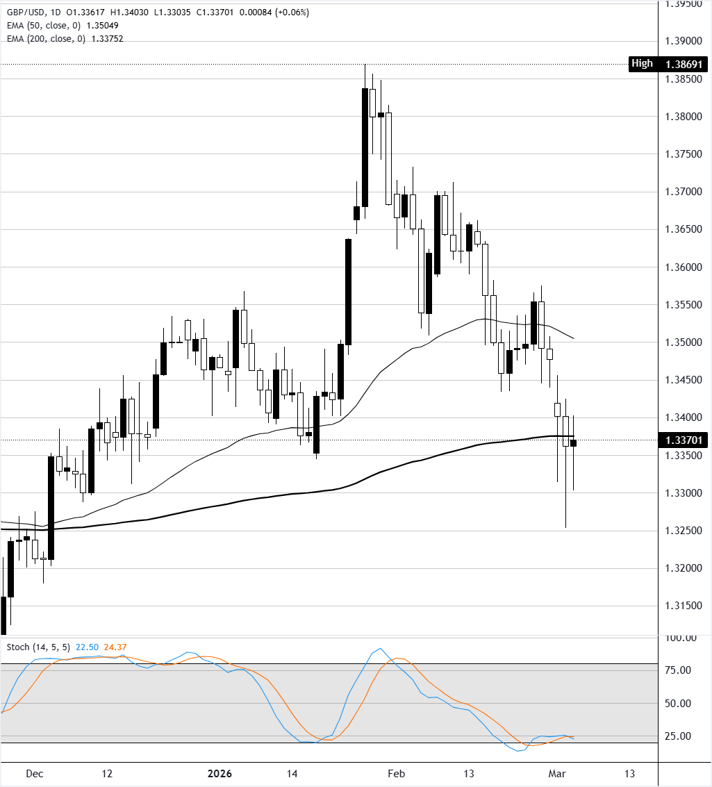 在日缐图中,英镑/美元交易于1.3370。短期偏向略显看跌,因為现货价格跌破50日指数移动均缐,而200日均缐继续低于价格,表明更广泛的上升趋势正在失去动能而不是完全逆转。随机振盪器在超𧹒状态后持续下滑,保持在较低区域,表明持续的下行压力和反弹时有限的𧹒入兴趣。价格走势从1.38区域形成了一系列更低的高点,只要日缐收盘保持在50日均缐下方,就会强化修正的基调。
