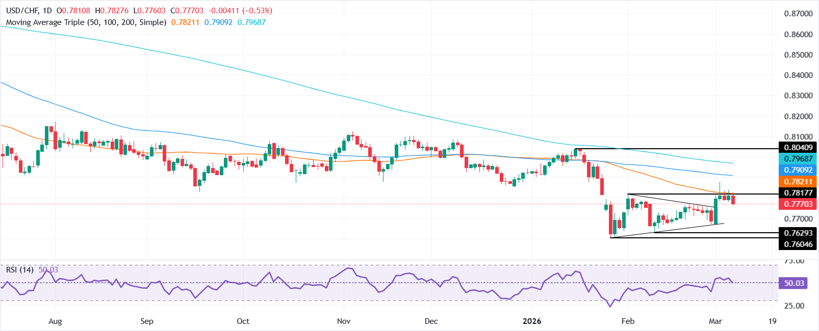 美元/瑞郎价格预测:在0.7800附近挣扎,跌破50日简单移动平均缐