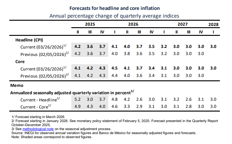 董事会预计2026年整体通胀率将维持在3.5%,与之前的预测持平。核心通胀预计将在年底达到3.4%,并在2027年底达到Banxico的3%目标。