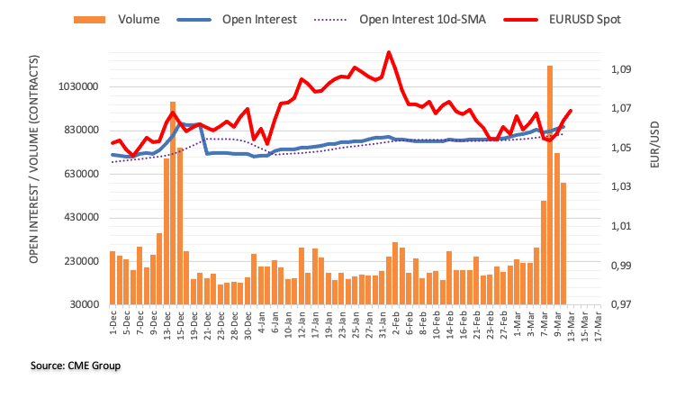 支持欧元/美元走强的观点,过去三个交易日的未平仓合约有所增加,而交易量在3月7日鲍威尔事件后回落到更 "正常 "的水平。