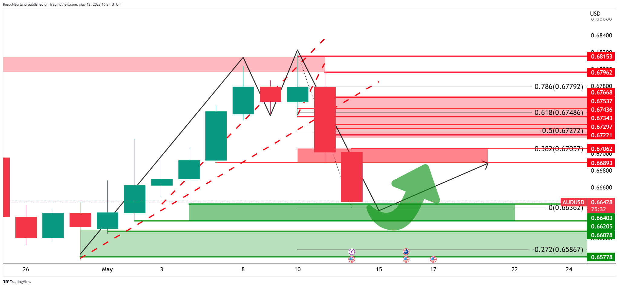 澳元/美元已经上行挑𢧐0.6700区域,该区域是M形态中看跌趋势的38.2%斐波那契回撤位,上周五收盘后𫔭盘前市场分析中对此进行了说明: