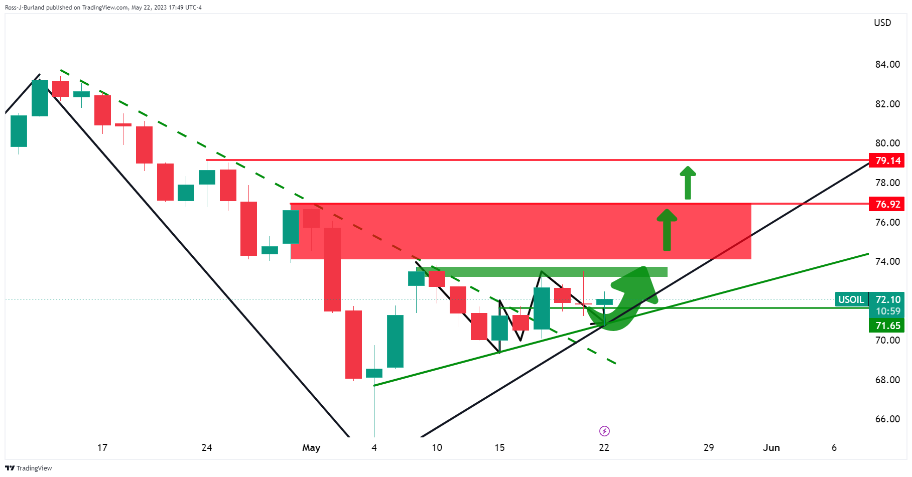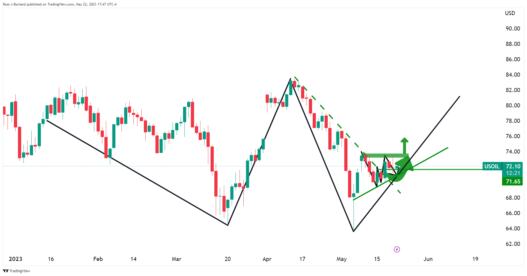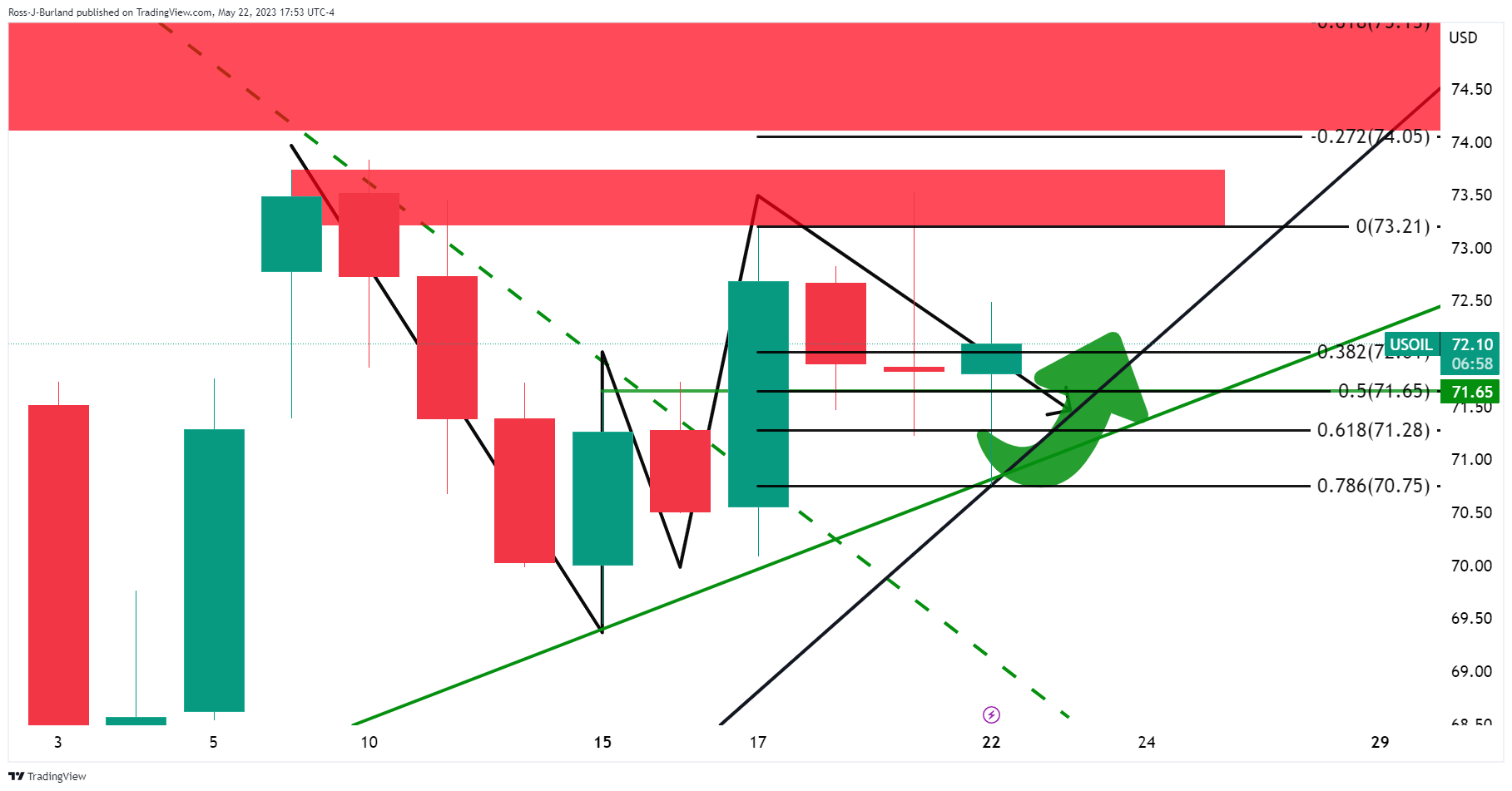发稿时,到目前為止WTI油价略上涨0.36%,自低位70.72美元攀升至高位72.49美元。以下是WTI油价看涨前景技术分析。