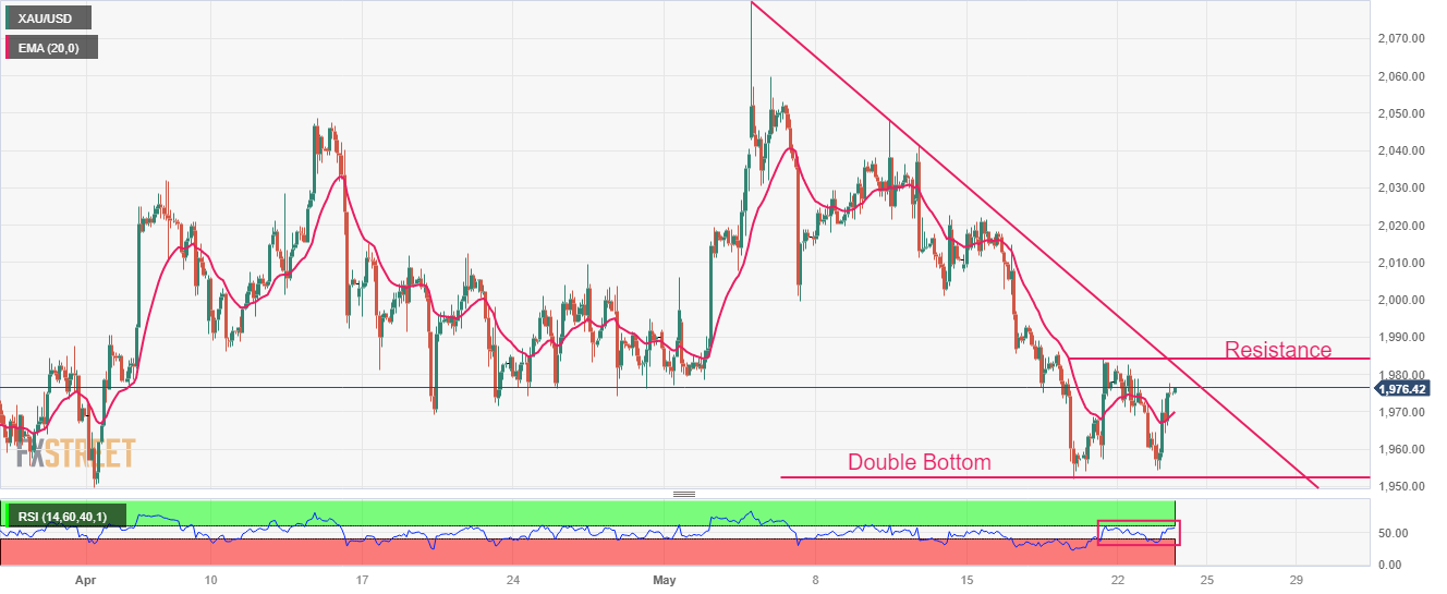 金价已经攀升突破20期指数移动均缐(EMA)1,970.00美元,这表明金价短缐趋势已经转好。