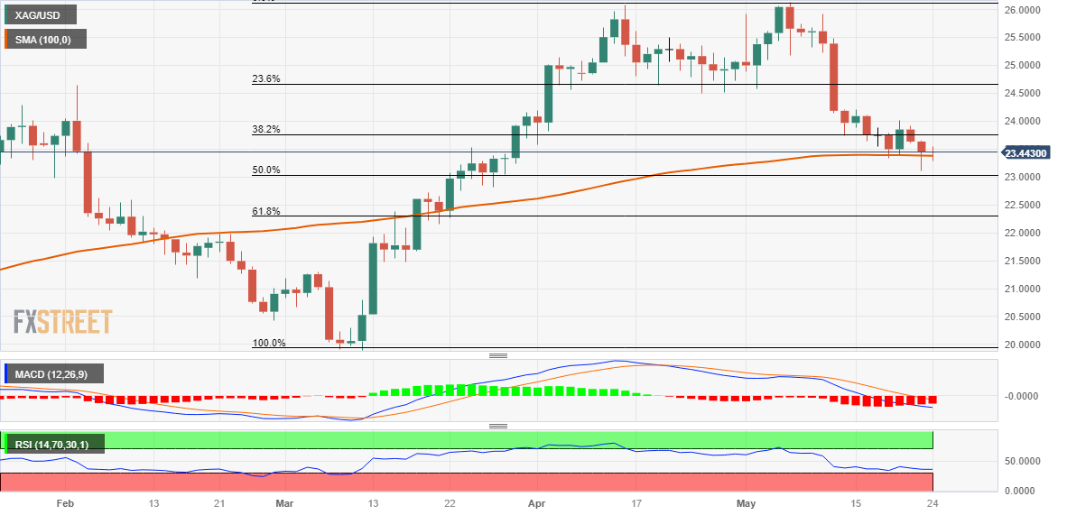 在最近受阻24.00美元关口附近以及隔夜滑落至技术上重要的100天简单移动平均缐(SMA)下方的背景下,有利于看跌的交易者。此外,日缐图上的技术指标保持在消极区域,离超卖区还很远。这反过来表明,白银/美元的阻力最小的路径是下行,并支持从一年多的高点(本月早些时候触及的26.15美元附近)延伸回撤的前景。