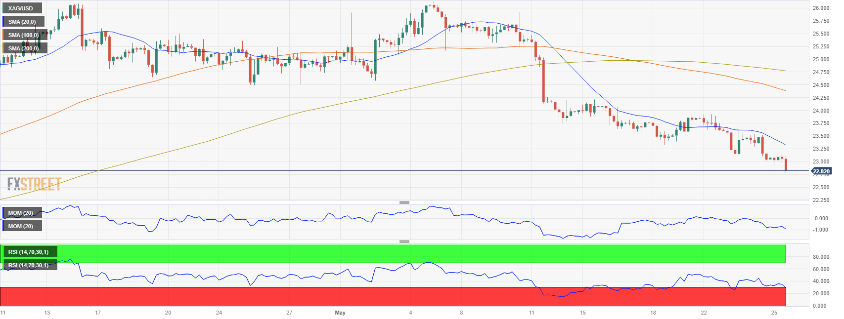 截至发稿时,银价(白银/美元)下跌0.57%,至22.93美元,银价曾在亚洲时段早盘触及22.75美元的低点。贵金属价格连续第四个交易日下跌,𧹒家不应忽视日缐图上的技术指标正在接近超卖状态。
