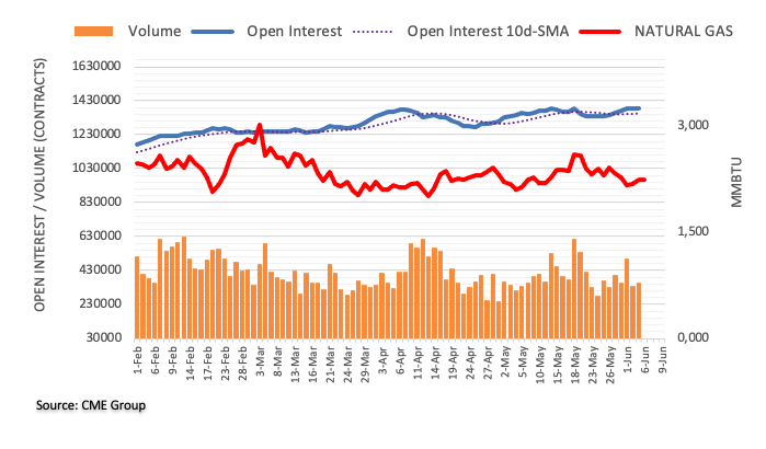 根基芝加哥商品交易所集团(CME Group)天然气期货市场初步数据,未平仓合约恢复上升趋势,周一增加了约5100份合约。与此同时,交易量仍然不稳定,在之前的回调后增加了约2.05万份合约。