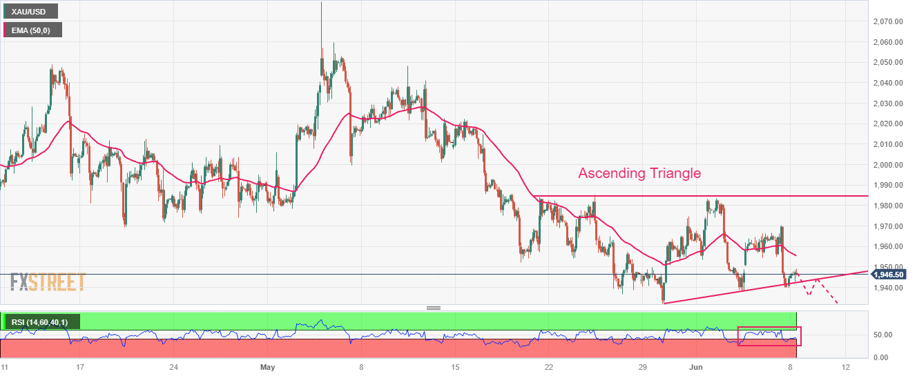 两小时图显示,金价徘徊在从5月30日低点1932.12美元𫔭始绘製的上升三角形上轨附近。上述形态的水平阻力位来自5月19日高点1,983.29美元。贵金属在50周期指数移动均缐(EMA)1,955.38美元下方交易,这表明短期趋势是看跌的。
