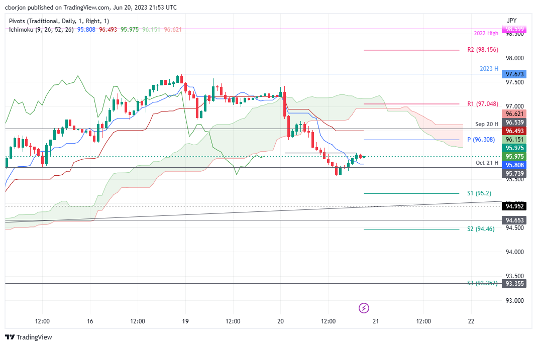 调整到小时图,显示澳元/日元将扩大跌幅,但支撑位在转换缐95.80附近。若跌破该水平,澳元/日元将测试6月20日的低点95.57,然后挑𢧐日图轴心第一支撑位95.20,接著是日图轴心第 – 支撑位94.46。