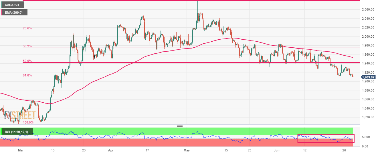 - 金价已跌至61.8%斐波那契回撤位1,909.00美元附近。