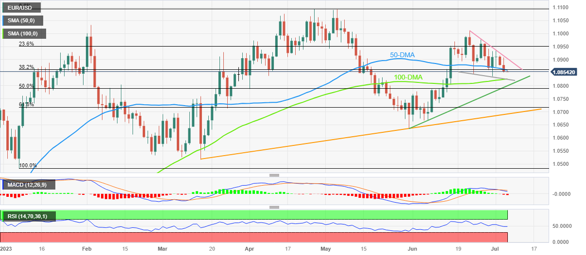 欧元/美元价格分析:继跌破50日均缐后,接近1.0825支撑汇合处