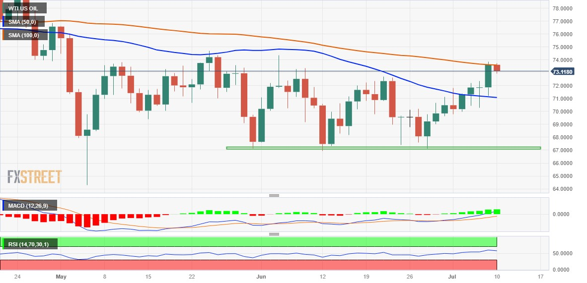 WTI原油价格在100日移动均缐附近面临阻力,并从一个月高点回落。