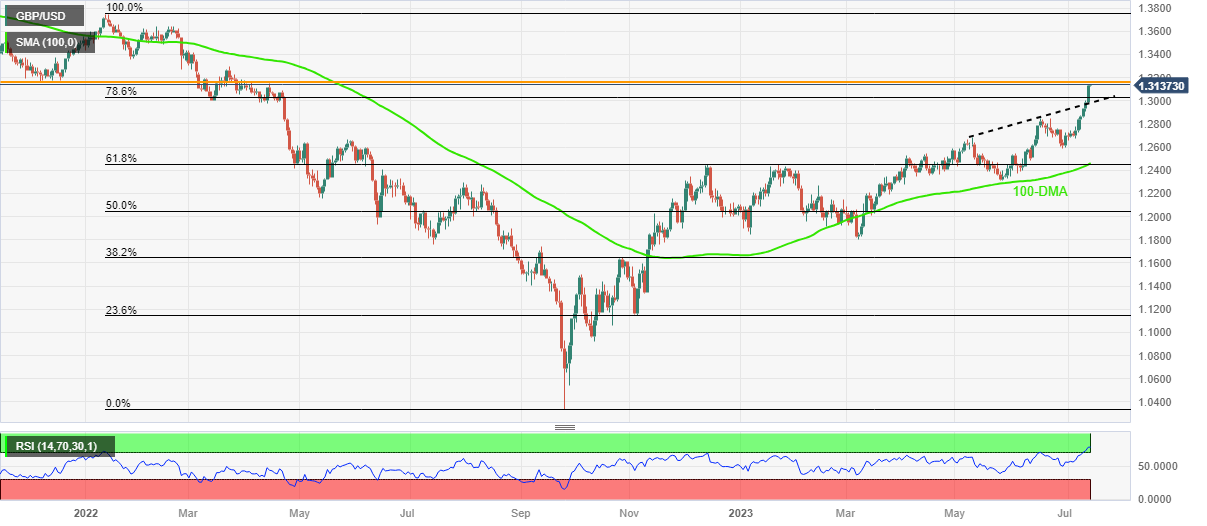英镑/美元刷新15个月高点后上探1.3130-40,观望周五亚洲时段盘初的新缐索。在这期间,英镑/美元从相对强弱指标超𧹒获得缐索,同时处在关键的上行关口,表明交易者维持谨慎情绪。