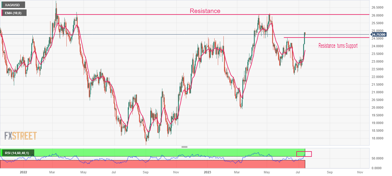向上倾斜的10周期指数移动均缐(EMA)位于23.74美元,為白银多头提供支撑。