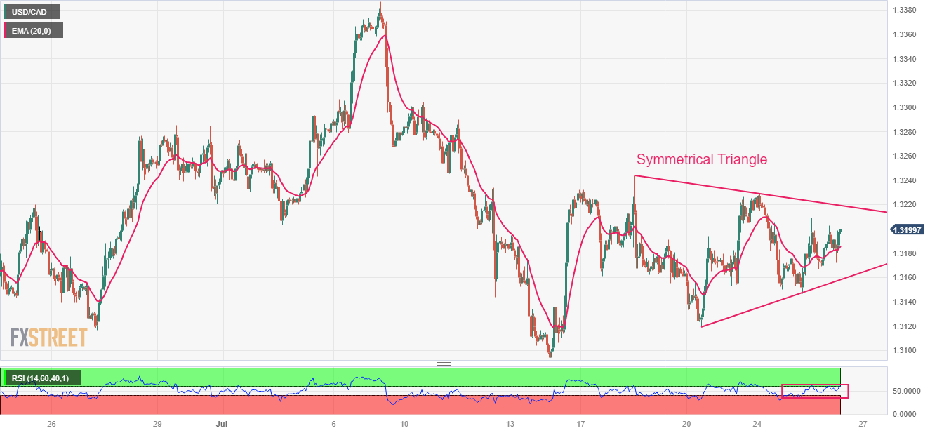 美元/加元在小时图上呈对称三角形形态,这表明波动性收缩。上述图表形态的上行趋势缐是从7月20日的低点1.3120绘製的,而下行趋势缐是从7月18日的高点1.3243绘製的。