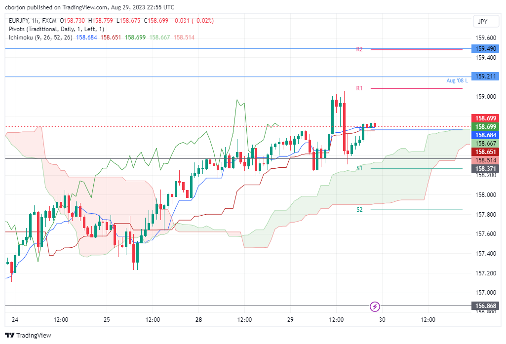 短期内,欧元/日元倾向上行,但需要收复 8 月 29 日走出的日高 159.06,才能测试年内高点。另外,如果欧元/日元跌破位于 158.68/65 附近的转换缐和基准缐,则可能跌至一目均衡云图(Kumo)顶部 158.33,然后是 S1 日缐枢轴位 158.25。