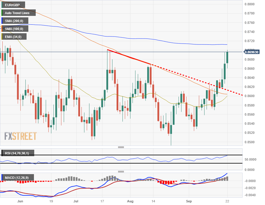 欧元兑英镑上周再次上涨,接近目前处于 0.8720 附近的 200 日简单移动均缐 (SMA)。