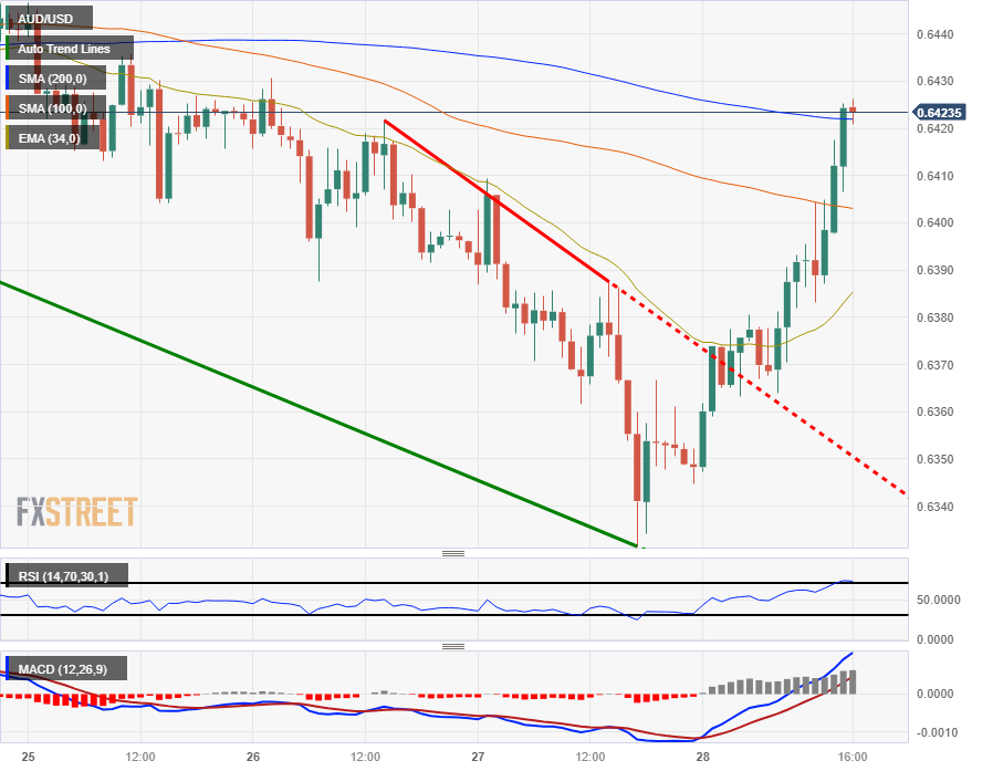 澳元摆脱了近期的日内看跌走势,跳涨了一个百分点,徘徊在 200 小时简单移动均缐 0.6420 附近。