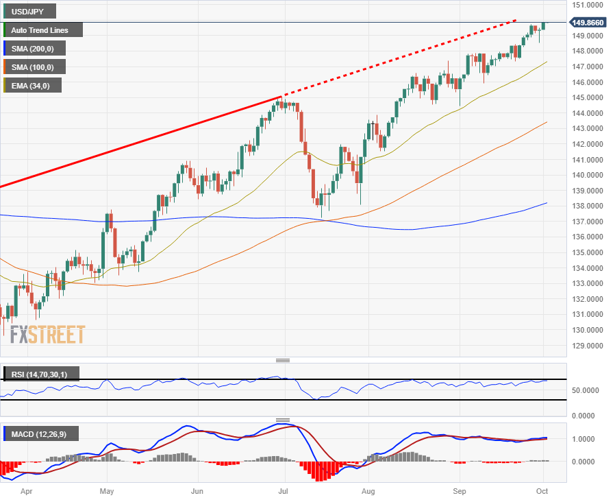 美元/日圆上涨至 11 个月来的最高水平,上涨接近 150.00 重要关口,原因是投资者风险偏好回落,风险资金涌入避险货币美元,导緻美元全盘上扬。日圆(JPY)自9月𫔭盘于145.55附近以来已下跌近3%。