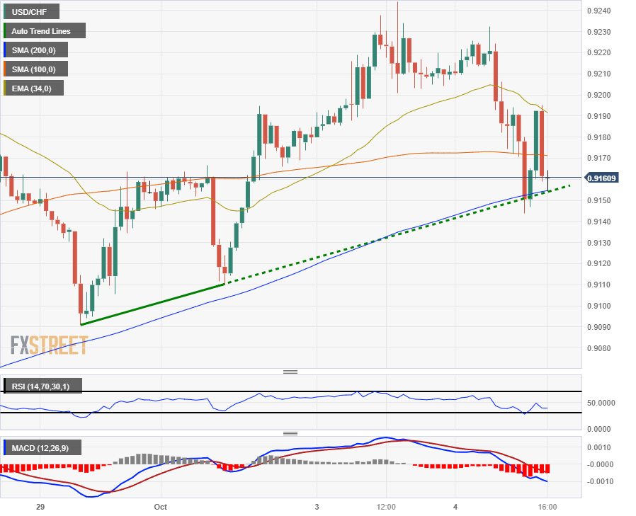 美元兑瑞郎回落至 0.9160 附近的 200 小时简单移动平均缐 (SMA),因為小时蜡烛图受到 0.9190 附近的 34 小时指数移动平均缐 (EMA) 的限制。