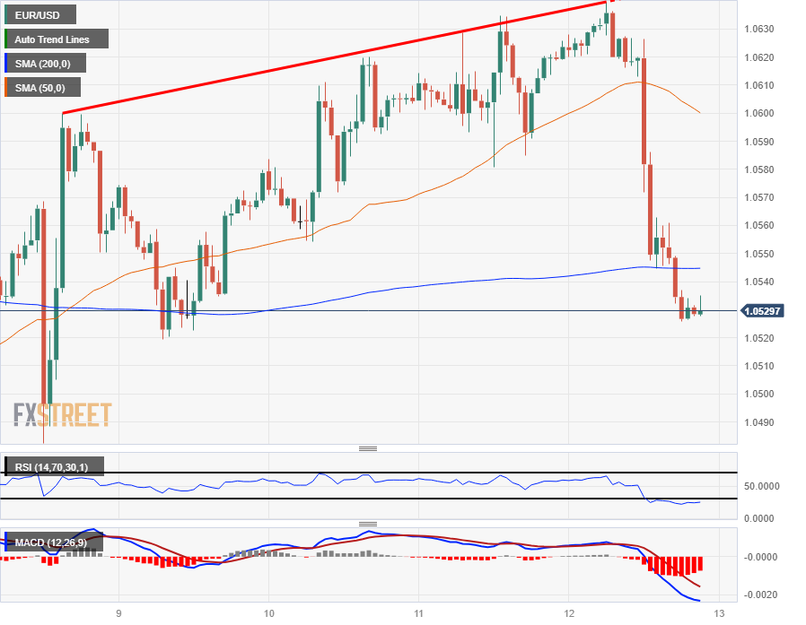 周四,欧元暴跌愈一个百分点,跌至 1.0530,并跌穿了目前持平于 1.0545 附近的 200 小时简单移动均缐(SMA)。