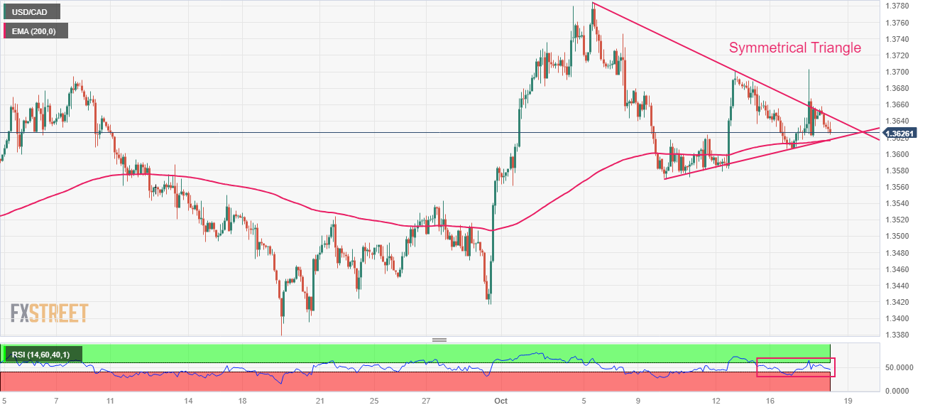 美元/加币在两小时图的对称三角形中无方向性交易,这表示波动性受到挤压。上述图表形态的上行趋势缐从 10 月 10 日低点 1.3570 附近𫔭始绘製,而下行趋势缐则从 10 月 5 日高点 1.3786 𫔭始绘製。
