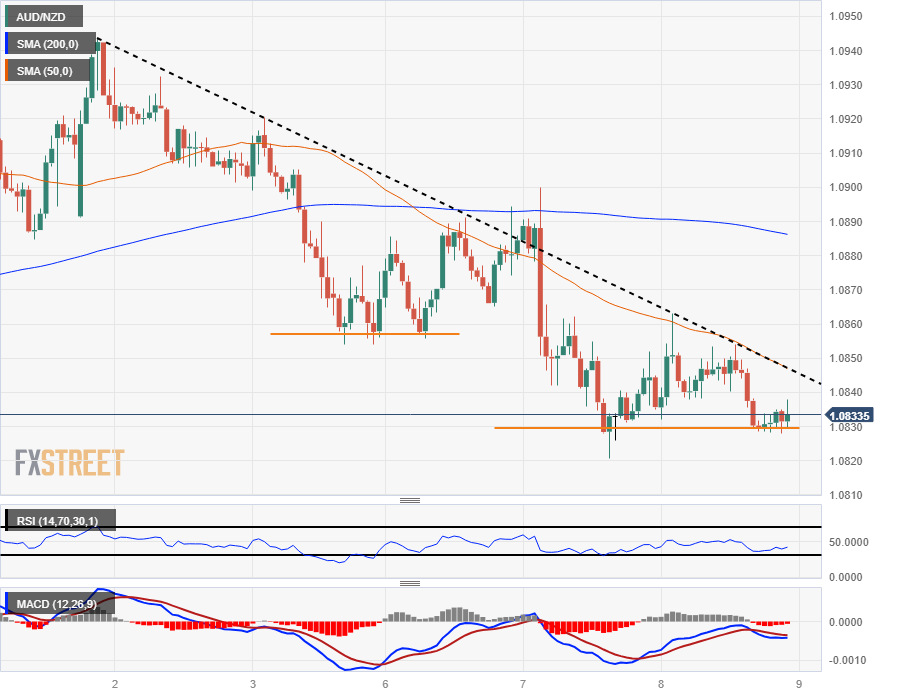 由于澳元跌破了200小时简单移动均缐(SMA),日内技术形态走出更低的低位表明澳元看涨动能耗尽,这意味著澳元/纽元将延续看跌走势。