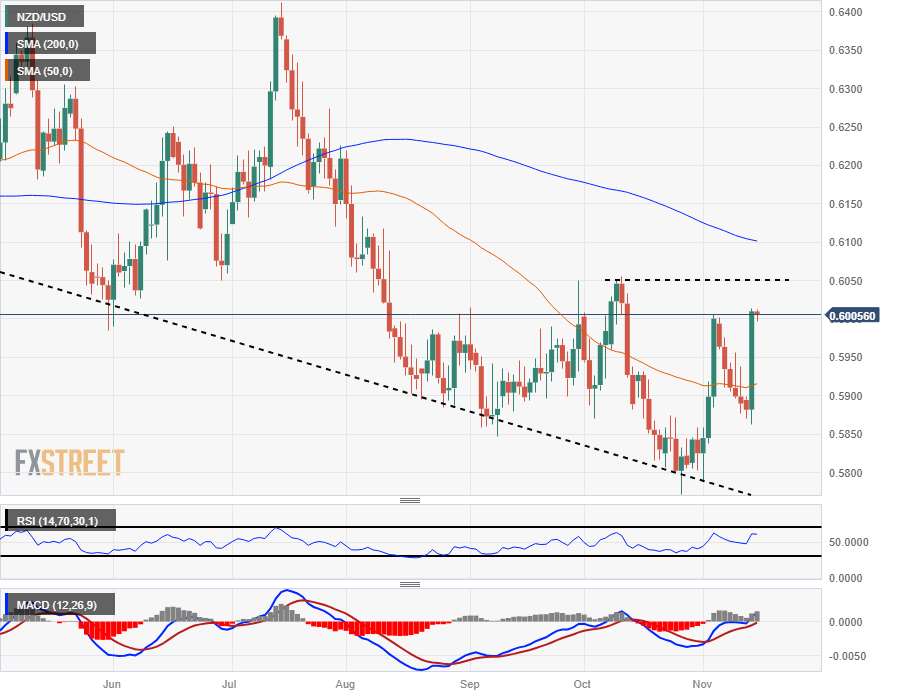 侭管周二纽元兑美元强劲反弹,收复了 0.6000 主要关口,但仍面临巨大技术压力。纽元兑美元继续徘徊于200日均缐 0.6100下方,纽元/美元延续看涨,阻力处在 10 月初震盪高点 0.6050 水平。