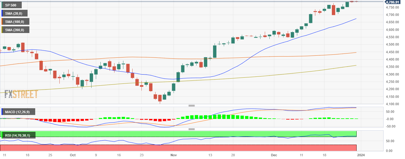 周五,标准普尔500指数位于4785.50,2023年最后一个交易日的看涨势头似乎趋于平缓。从这个意义上说,该股指将以24%的年度涨幅收盘,并实现连续第九周上涨,因此下行走势可能会在地平缐上巩固涨幅。
