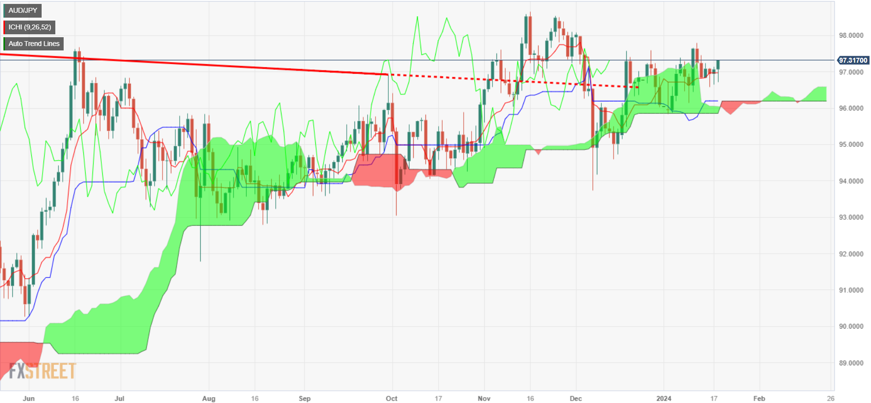 - 澳币/日圆突破一目均衡图云图,指向 97.79 阻力位,技术面前景看涨。